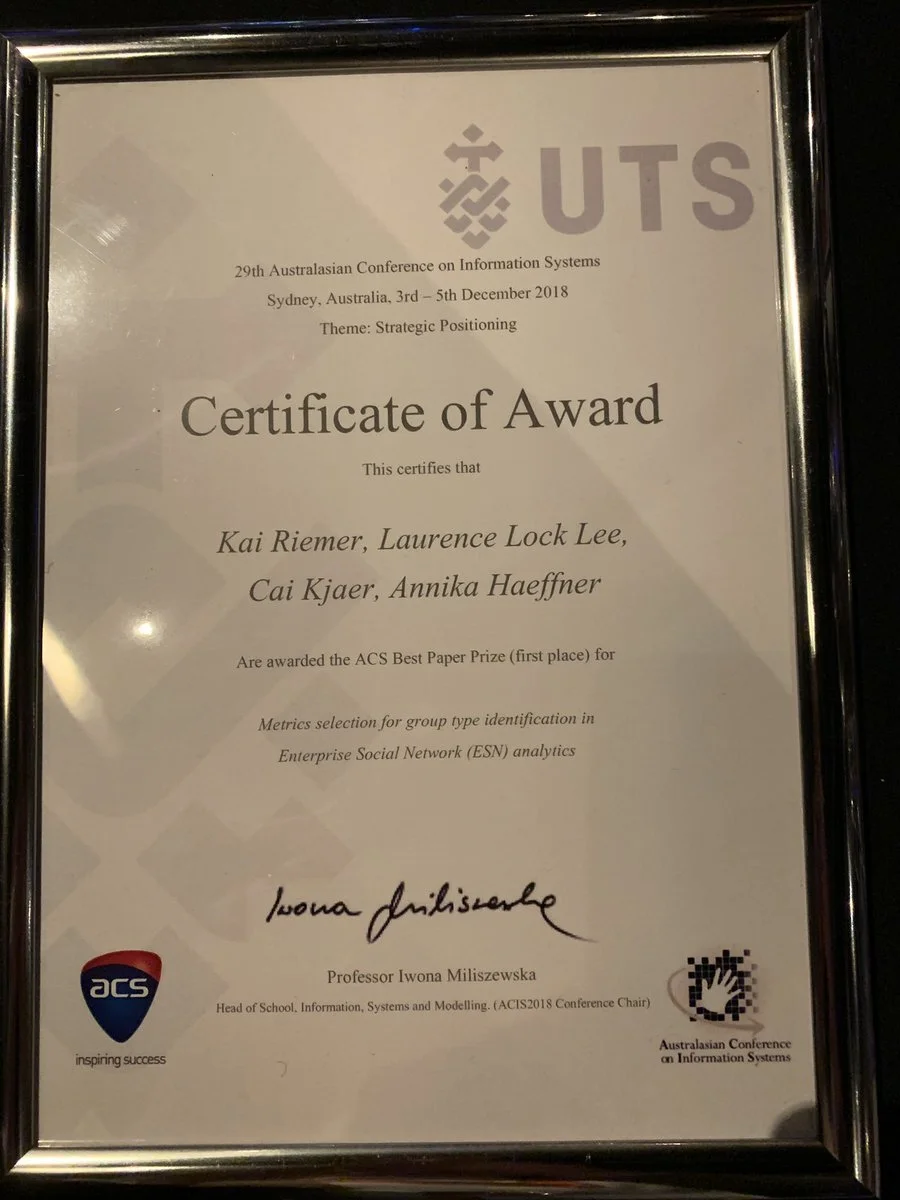 We’re proud, and a little humbled, to have won the Best Paper at the 29th Australasian Conference on Information Systems for our research into group types on Enterprise Social Networks.